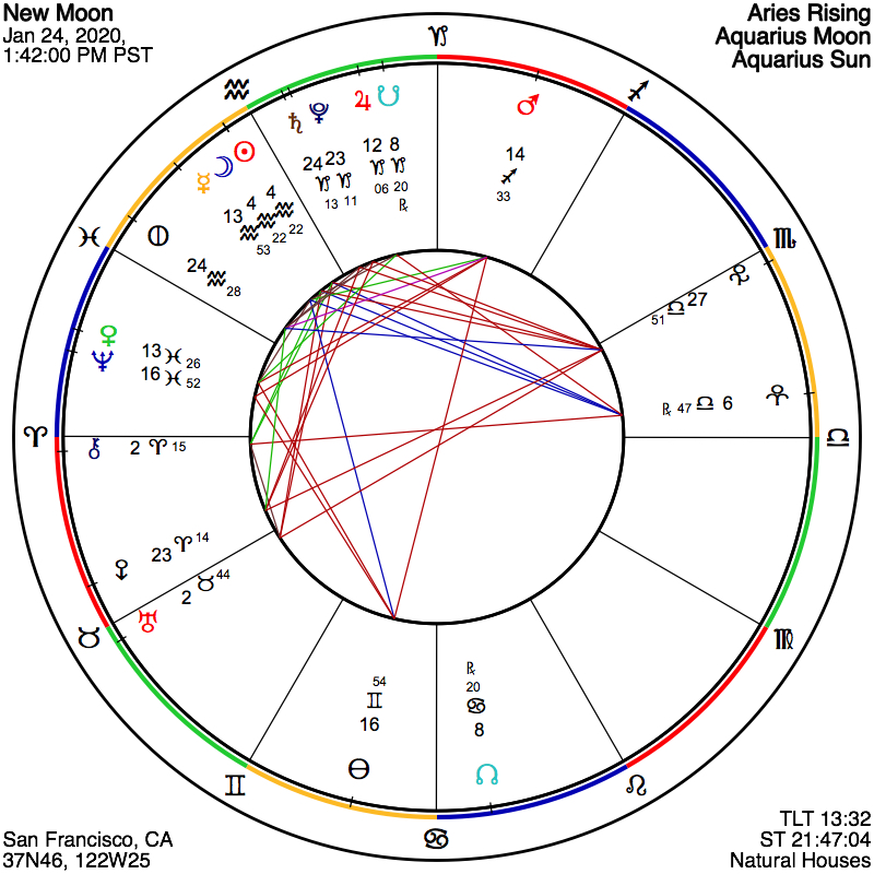 The Sabian Symbol for this New Moon might be able to shed further light on what this lunation is attempting to express to us. It is, for the Sun and Moon, in the 5th degree of Aquarius, “A council of ancestors,” reminding us that – as we view the massive current transformations of our society – the past is prologue. Marc Edmund Jones, who caused these symbols to come into being nearly one hundred years ago, comments upon “the enduring reality which (humankind) creates in the over-all ideal we accept for ourselves” and states, “Self ultimately must fulfill itself – (engendering) power through absolute self-integrity.” May this indeed be so for every one of us, as we continue to navigate our way through the maelstrom of our current cultural disintegration, and its rebuilding itself upon the ashes of the old.