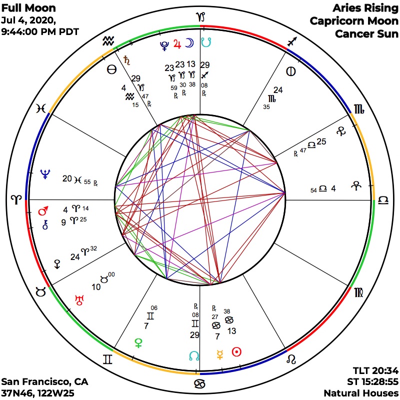 Saturday’s Full Moon, taking place on the late evening of America’s Birthday, July 4th, for the West Coast, at 9:44 PM PDT, which is early morning of the 5th for the East Coast and Europe, is happening during fraught times for this country. This is indicated in the astrology by the continued great emphasis on Pluto, both in the solstice eclipse New Moon, at 0 Cancer, which two weeks ago kicked off the current Soli-Lunar cycle, and in this upcoming Full Moon eclipse configuration. Note that this is a “penumbral” eclipse, in which the Earth’s shadow hits the Moon with only a glancing blow, and will be barely visible as a result. To astrologers however this counts as a lunar eclipse, or an extra-powerful Full Moon. As such, it is of great interest to note that the Moon is found to be in mid-Capricorn, technically conjunct in the sky with transformational Pluto, as strengthened by Jupiter in conjunction, and by the ongoing T-square to Pluto-Jupiter from new planets Eris, in Aries, and Haumea, in Libra, with Pluto and Jupiter at 23 Capricorn. Additionally, we find that Pluto in this Full Moon configuration is highlighted by being closely contra-parallel to the eclipse Sun.