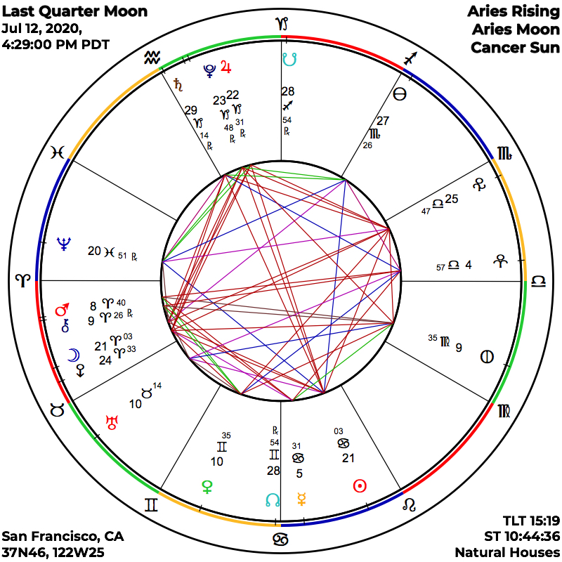 As the intensity of 2020 continues without letup, we, as always, look to these still quite potent astrological configurations to understand more about the underlying meaning of events and how they may continue to unfold. This evolutionary churning is vastly transforming to the collective energies and manifestations of our world, and to each of us individually. We are, after all, parts of the greater whole. On the afternoon/evening of Sunday, July 12th, we have a Last Quarter Moon in Aries, and this lunar phase arrives directly after the intense Eclipse Season that began on June 5th with a Full Moon Lunar eclipse, peaked on the Solstice of June 20th with a New Moon Solar Eclipse, and ended just last week on July 4th with another Lunar Eclipse and Full Moon. On the occasion of this Last Quarter Moon, we do well to look back over the past 37 days of the eclipses to reflect upon what healing has transpired, along with the ongoing massive transformation of our society, and of ourselves. We will also want to reflect on how we might integrate these significant shifts as we chart our course moving forward.