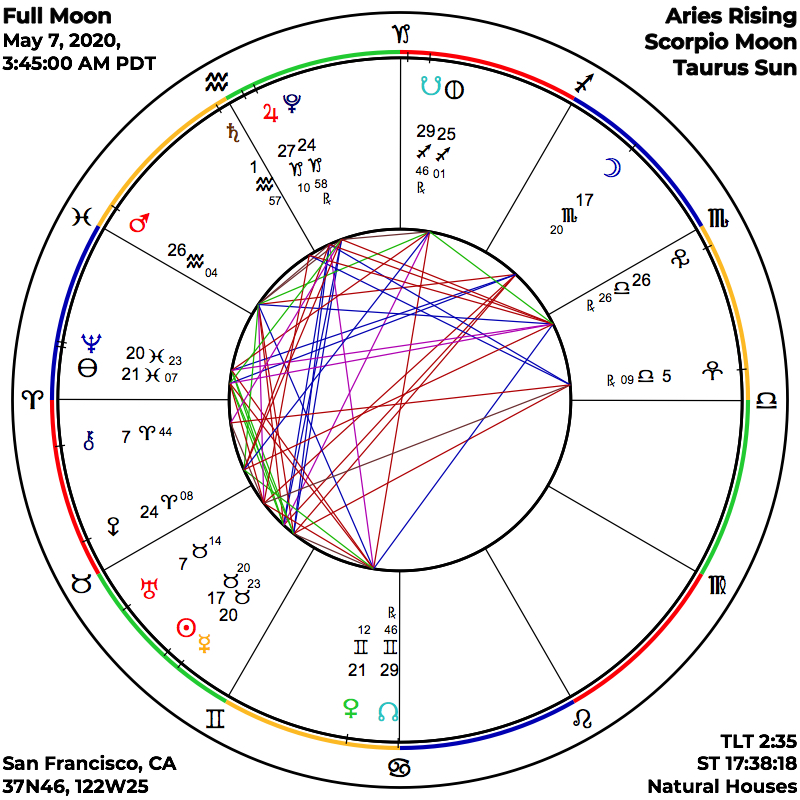 Thursday morning’s Full Moon in Scorpio, taking place early on May 7th and occupying the opposite sign from the Taurus Sun, creates a natural condition of fulfillment in the lunation cycle that began last month with the Earth Day New Moon that also featured a prominent placement of transformationally oriented Pluto, conjunct Jupiter. In this current Full Moon lunation, Pluto, now retrograde, occupies the exact same degree as two weeks prior, with Jupiter close by. Jupiter is getting ready to station to retrograde motion as well, in a week, just in time for the rather climactic Last Quarter Moon of May 14th, again emphasizing Jupiter-Pluto. We therefore have a month of May with strong transformational impact, as was April before it, and this is consistent with what we see all around us in the zeitgeist, with the new coronavirus barely contained, world wide, and especially virulent here in the United States. The federal government is advising that the country re-open, some say prematurely, and the government itself is admitting that US deaths could climb as high as 3,000 per day as a result. These are dire times indeed, and the astrology supports this idea, with the additional notion that there is an inherent silver lining to be found, since the essentially beneficial vibes of Jupiter are also involved. We might have cause to wonder – what positive take can we make out of this global and local catastrophe? The answer would seem to be in our response to what we are dealing with, the awareness generated, and the lessons learned.