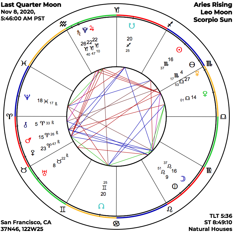 Sunday morning’s Last Quarter Moon, taking place in the early hours of November 8th, midday for Europe and points east, represents the final major lunar phase of this strongly transformational cycle that was initiated by the New Moon configuration from mid-October. This cycle, punctuated as well by the October 31st Full Moon in precise conjunction with trickster Uranus – promising surprises and unusual revelations – still has a powerful kick as it winds down. This Last Quarter phase, termed by noted 20th century astrologer Dane Rudhyar as “crisis in consciousness,” represents a critical juncture of integration of what has transpired thus far in the developmental sequence from one New Moon to the next, with special emphasis on where lessons have been taken in, and resulting awareness gained, hopefully in the direction of more complete understanding. This shift in perspective is especially marked here in the US for practically the entire population, as they have closely watched the unfolding presidential election situation, and for worldwide observers of this political activity as well, plus in facing the local developments that they are a part of.