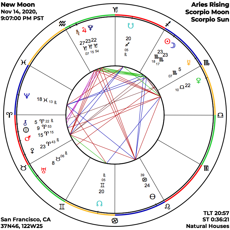 This weekend’s New Moon in Scorpio, taking place on November 14-15, late Saturday evening on the west coast, early morning Sunday for the east coast and Europe, is a rather remarkable lunation. The triple conjunction of Saturn, Jupiter, and Pluto is reaching its peak, now that Jupiter has moved forward to lie between the other two, in a culmination of the Saturn-Pluto combination that has been active all year, beginning January 10th, and that has signaled a societal transformation that was being discussed by astrologers several years back, when the November timeframe was singled out. As a side note it is somewhat ludicrous that disparaging remarks have flown around regarding the fact that astrologers did not predict the Covid pandemic, when in fact they predicted a huge societal reset this year, because of Saturn-Pluto, and Saturn-Jupiter-Pluto in this very month. Now, here we are.