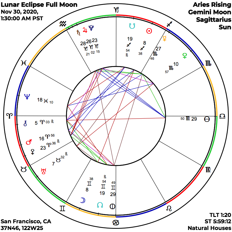 The Sabian Symbols for this Lunar Eclipse offer us further insight, with the Sun’s symbol of 9 Sagittarius (8 +) being “A mother with her children on the stairs.” In describing this symbol, which Marc Edmund Jones had the responsibility for creating nearly one hundred years ago, he emphasizes the focus on an individual’s development of social conscience as a fundamental contribution to collective well-being. For the Moon, the symbol of 9 Gemini is “A quiver filled with arrows,” emphasizing the alertness and cultivated presence on an individual level that is required to meet each moment with skill and clarity. This points to an encouragement of Self development as the path to greater freedom in meeting the practical demands of life with ease and grace. May we each endeavor to rebirth ourselves through the challenges of these difficult times into both individual and collective expressions of Love and Well Being.