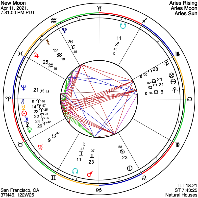Sunday evening’s New Moon in Aries, taking place at 7:30 p.m. on the West Coast and later in the evening for points east, is a slam bang of a potent lunation, with Eris at 24 degrees of Aries sandwiched directly between the New Moon and Venus, all within four degrees of late Aries.