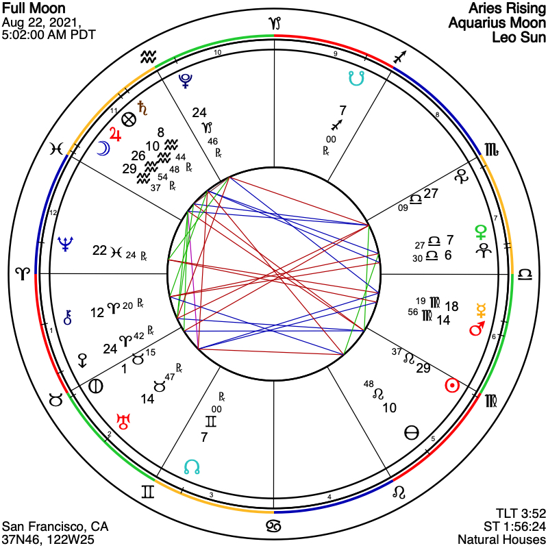 The August 22nd Aquarius Full Moon, taking place in the morning hours of Sunday, in the U.S., is the second Full Moon in Aquarius this summer, as the previous Full Moon of July 23rd was also in Aquarius. This is quite rare, because the successive Full Moon Suns are about thirty degrees apart, and there are only thirty degrees in a sign! As part of this phenomenon, the August 22nd Full Moon takes place at 29 ½ degrees of Aquarius (Moon) and of Leo (the Sun) therefore just preceding Virgo season by a few hours of time. Then, too, this double dose of Aquarius could be characterized as leading us down unconventional pathways into uncharted territory. The Fixed Air sign of Aquarius can be said to live to march to the beat of its own drum, and the lunar light reflected through this lens may have us actively seeking where we can experiment with expressing our own dynamism, by exploring the unique shape of who we truly are. With the Moon also in a close conjunction with Jupiter, this configuration offers us a larger-than-life opportunity to blossom into a more expansive view of our own individual circumstances, and our attitudes toward what we are ultimately up to in this lifetime.