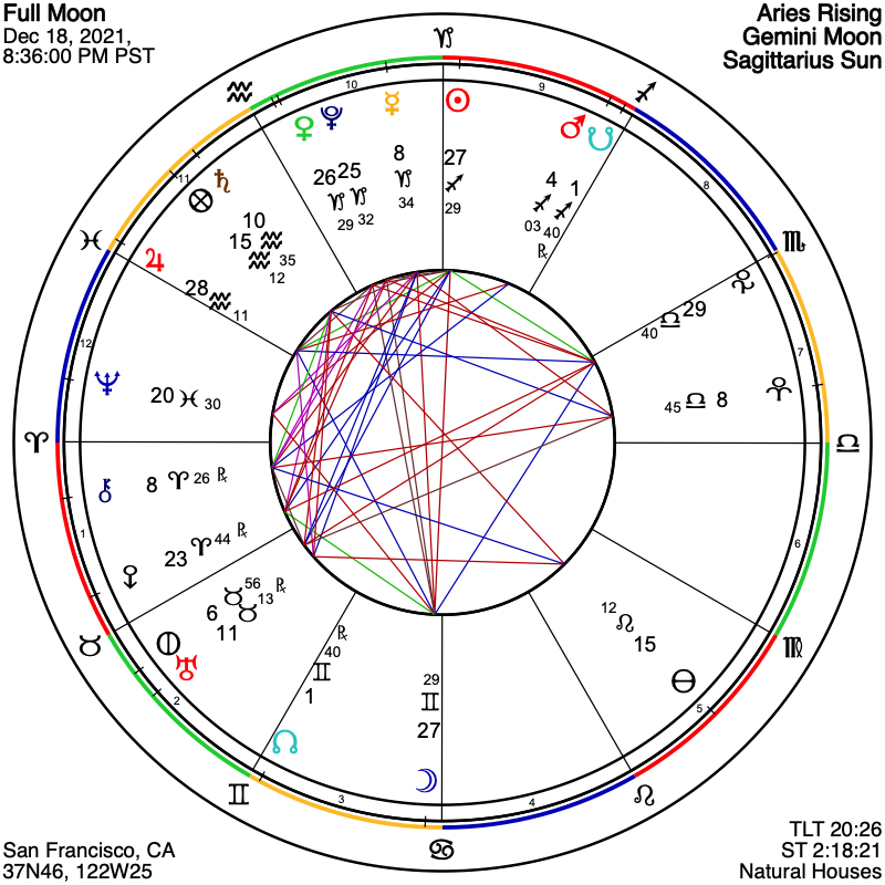 The Gemini Full Moon, taking place on Saturday evening, December 18th, at 8:36 PM PST, later evening to early morning on the 19th for points east, represents another potent lunation. Coming at the midpoint of the December lunation cycle that was kicked off by the solar eclipse of December 3rd and 4th, and equally reflecting these rather intense times that we are currently living through on both individual and collective levels, this Full Moon is oriented toward a thorough-going metamorphosis of our energy for intimate connection with others and with ourselves. It features stationing Venus in close conjunction with transformational Pluto and highlighted by the Sun and Moon, while Saturn and Uranus are closely square at this timing also, by far less than one degree, thus indicating the vast chasm between conservative and progressive attitudes in the culture and in each of our own individual lives as well. Then, too, there is also a strong presence of Chiron, the Wounded Healer, about to station to direct motion the next day, on December 19th, emphasizing our internal wounding, the likely residue of early trauma, and our capacity to heal the issues. This is a very significant configuration, made especially so by the long-term Venus-Pluto conjunction that will affect everyone, most particularly those with planets or sensitive point in their charts in late degrees of Cardinal signs.