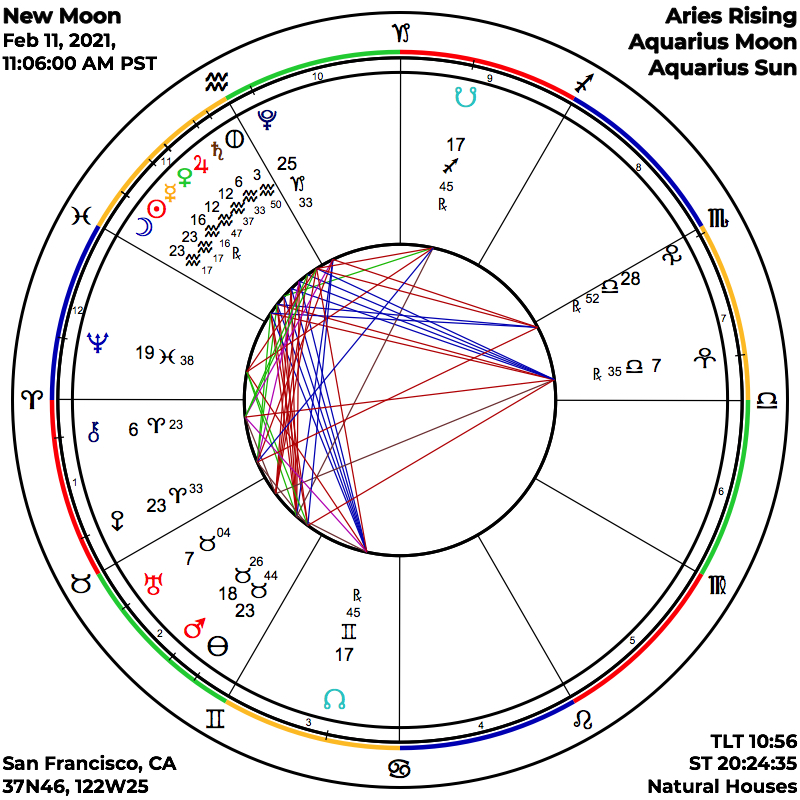 The Sabian Symbol for this New Moon degree, the 24th of Aquarius (23 +) may be helpful. It is: “A man turns his back on his passions, to teach from his experience.” Along with the Aquarian emphasis, this degree symbol for the New Moon signals another grace note for an essential modicum of reason over unreasoned emotion, in forging further forward toward solving our most pressing personal and societal problems.