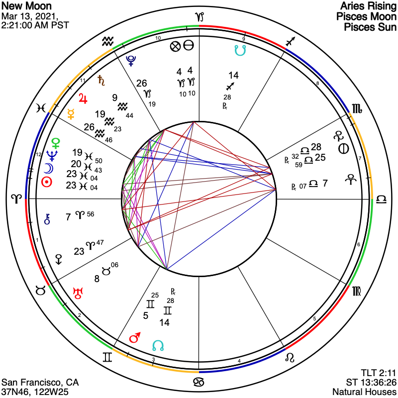 The Pisces New Moon of Saturday, March 13th, taking place at 23 + degrees of the sign, is aligned once more with both Eris in Aries and with Pluto in Capricorn, indicating that the cosmic agenda has not in any way let up, of ongoing structural transformation. This refers to the society at large, and to all of us as individuals within that matrix. Neptune also plays an important part of this New Moon, which takes place a mere 2 ½ degrees away from his overwhelming luminosity, in the same sign of Pisces, which he additionally rules. While Neptune is not often entirely recognized as a change agent, he is so, and we therefore remain in the midst of continued transformation, not only as reflected by the strong Pluto position, but also in that of Neptune, thus a double whammy of metamorphosis.