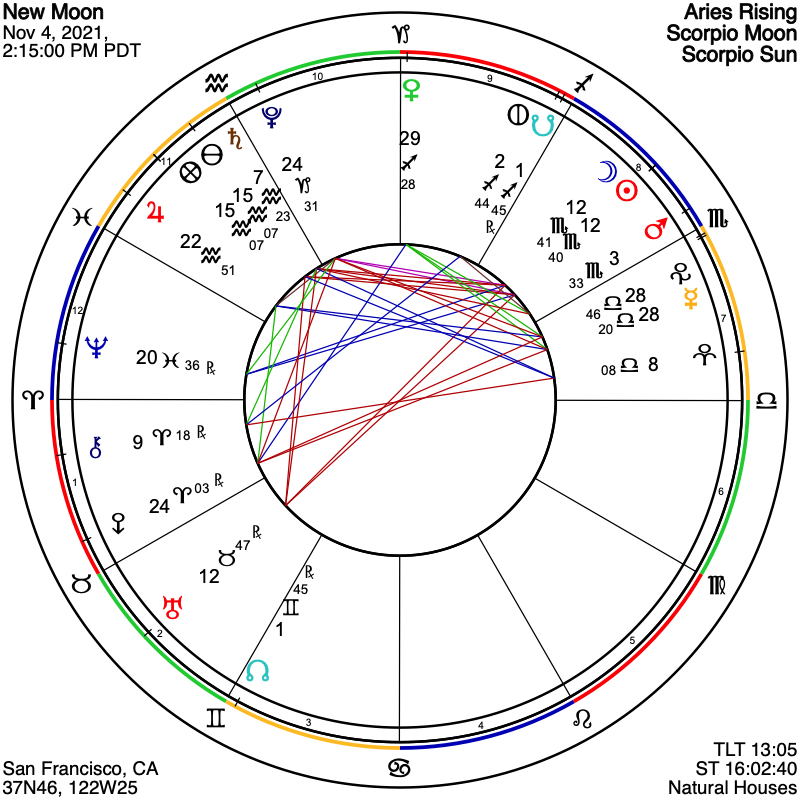 Another lunar cycle of a fraught nature begins on November 4th with a New Moon in the deep and mysterious waters of Scorpio. It will arrive at 2:15 PM Pacific Time, and is located at 12 degrees of Scorpio, thus featuring a partile (or same-degree) opposition with Uranus at 12º Taurus. Because this opposition is so close to exact, the themes of Uranus will be incredibly heightened in the timing of this event, and in the thirty-day cycle that follows. We all will experience – or at least witness – the brilliant and often disruptive influence of The Trickster archetype, along with its startling revelations. We also have in this New Moon configuration other somewhat difficult aspects that can spell challenge and prompt growth, as well as configurations that enliven our consciousness, and our awareness of the tremendous need for healing in our world.