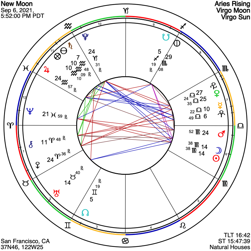 Monday afternoon’s Virgo New Moon, taking place after 5 PM PDT on September 6th, late evening for the east coast and early morning the next day for Europe, is entirely transformational in the setup of its outer planet energies. This can be confidently stated, because not only are Eris and Pluto in a partile (or same degree) square alignment, at the 24-degree mark of their respective signs of Aries and Capricorn, but what do we find at 24 degrees of Virgo but Mars, in partile trine to Pluto, and what at 24 degrees of Aquarius but Jupiter, in partile sextile to Eris, while Venus at 25 Libra is opposed to Eris, making a T-square to Pluto, lord of metamorphosis, death and rebirth. This entirely emphasizes the Pluto presence, which has been powerfully strong in the sky ever since January 2020, when it was also conjunct Saturn, inspiring astrologers all over the world to predict societal adjustments on a massive scale, long before the decade began. The Covid reset that we all experienced back then, and that we are still experiencing, can be attributed to this astrological signature, and the intensity of this “world transit” is growing for the current month. Like it or not, and resisting it or not, we are in for massive structural change, for the society at large, and in our individual lives as well. We are, all of us, caught in the cocoon like the dissolving body of the caterpillar, and whatever you might say about the glories of the future butterfly, the simple truth of the matter is that it is not much fun for the caterpillar!