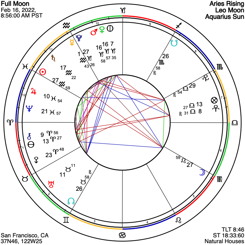 The upcoming Full Moon in Leo, taking place on Wednesday, February 16th, at 8:57 AM, Pacific Time, will be bringing us some powerfully bold and luminous vibes. When, as now, the Leo-Aquarius axis is activated by the Full Moon, we can look to see themes of individuality play out in the context of the collective, and how that is for each of us. This depends upon our own inclinations, as well as on the cultural values in which we find ourselves immersed. The Fixed signs in general are dramatically emphasized in this Full Moon, as they are throughout this whole year, especially with the strong placements of Uranus in Taurus in contrast with Saturn in Aquarius, coming back with a roar this fall. Because of this Fixed sign emphasis, we are encouraged to take notice of themes of innovation immersed with those of stability and steadfastness along with the potential for rigidity and stagnation.