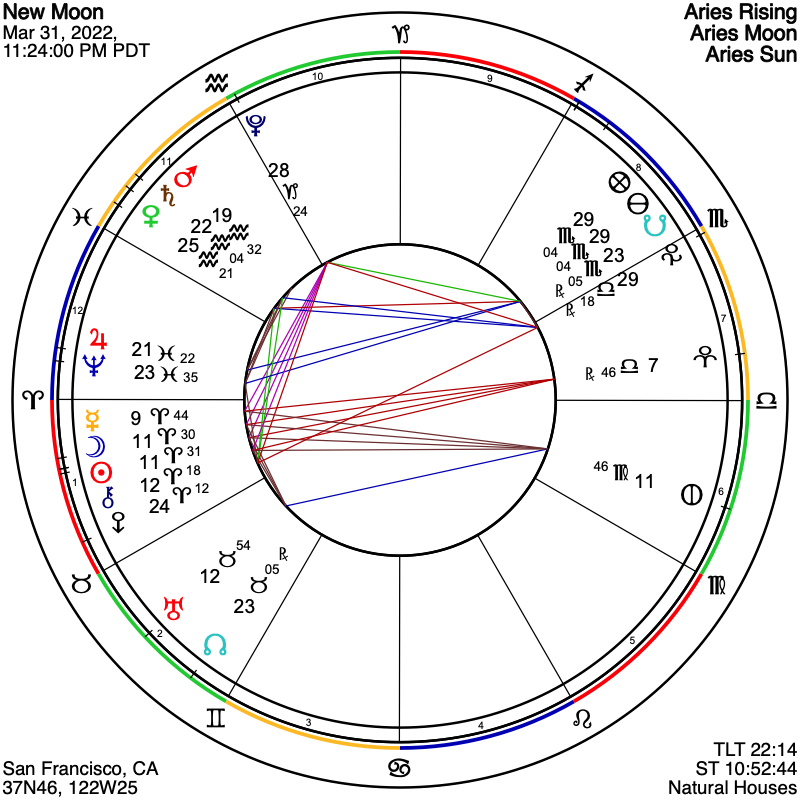 The Aries New Moon, taking place on March 31st at 11:24 PM PDT, is ushering in this lunar cycle with passion and courage, as well as a strong emphasis on healing journeys. These are themes that will be present throughout the month. The New Moon arrives in its exact position of 11º Aries just minutes before April 1st on the west coast, and on that very day itself for locations eastward. With Aries expressing its vibrant vital energy we could find our inner fires being stoked with a strong desire to keep things moving forward as well as courage that urges us to speak our truth. There’s also some whopping doses of Piscean energy that can soften and diffuse some of the heat and hard edges. This New Moon has very few hard (difficult) aspects, which may lighten the mood considerably and open up to more flow and ease in comparison to previous months.