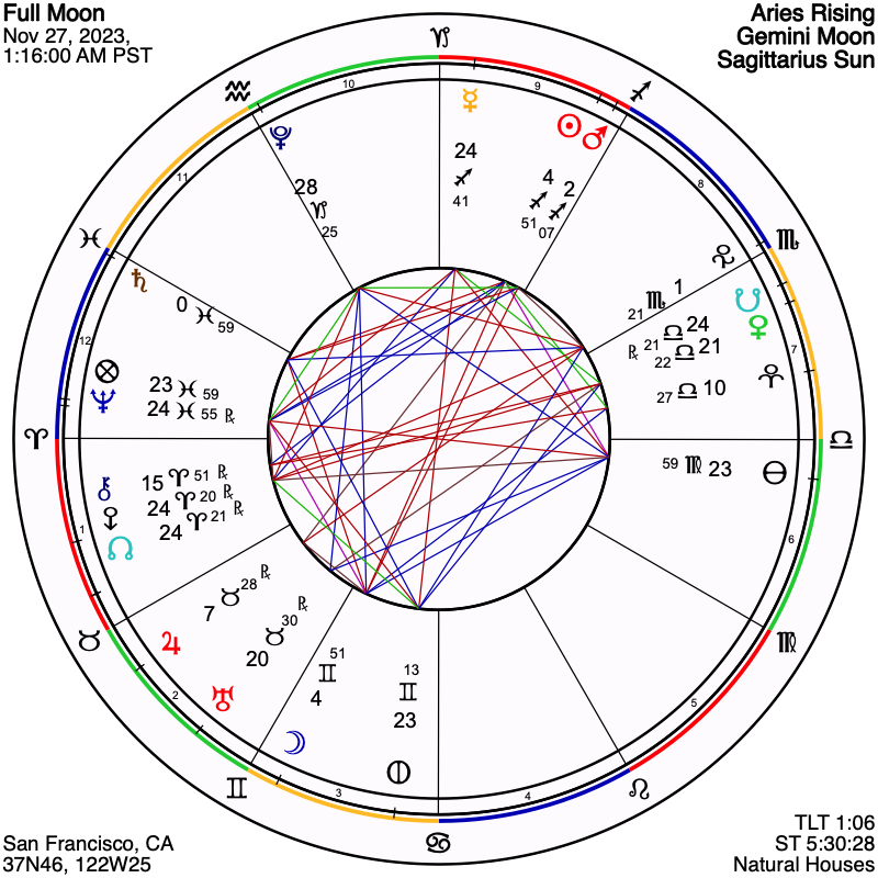 The Full Moon of the final week of November, taking place on Monday, November 27th, early morning PT, later morning for the east coast and Europe, makes for an interesting follow-up to the dramatic Mars-Uranus New Moon of November 13th. That recent initiation to the thirty-day lunation cycle still unfolding through the first ten days of December brought unexpected events of all kinds into the picture of our days and our activities, with novel thoughts also in the offing and new ways to see things. By contrast, the current configuration has the Sun at 4 Sagittarius, remaining within three degrees of Mars, and connected to – rather than the wild trickster energy of Uranus – stolid Saturn at the beginning of Pisces. Following the potentially wild flights of fancy from the previous two weeks there is now a deliberateness to the current astrology that might be beneficial and settling. In one way of understanding how the astrology of this Full Moon may play out, we could encounter difficulties in making of our new vision the actual reality that we would like to see; while in the best of outcomes, we are ready to take the new ideas of recent weeks into our normal working structure, thereby ensuring that we progress in our spiritual evolution as we grow.