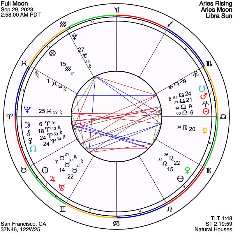 The Aries Full Moon graces our early morning skies on Friday at 2:58 am PT, later morning for the east coast and Europe. At 6º Aries, this Full Moon combines the essence of this cardinal fire sign – passion, surging vital energy, bold endeavors, and the indomitable spirit of the inner warrior – with the mild relating flow of the Libra sign that she opposes. In this cosmic dance, the Moon reflects the energy of the Libra Sun, initiating conversations about nurturing our relationships, the delicate art of balancing self and other, and perhaps as well the fine art of negotiation.