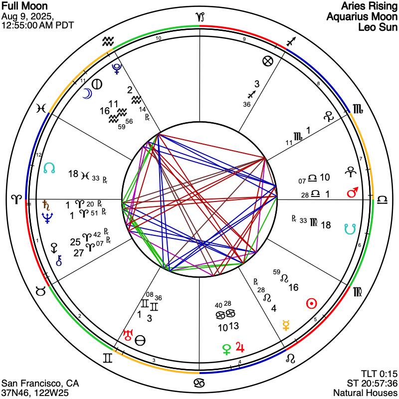 The Full Moon of August 9th, 2025 arrives at 12:55 AM Pacific Time, at 16º 59’ of Aquarius. This lunation shines across the axis of individuality and interconnection, the tension and harmony between Leo’s radiant self-expression and the potential productivity of that creative mode in terms of Aquarius’s vision of the collective good. Aquarius, with its gaze on the future horizon, carries seeds of brilliance and innovation. Under this Moon, we may feel the stretch between sweeping tides of cultural change and the sovereignty of our own lives. The balance point lies in offering our unique light to the wider human story. Questions surface: What systems are we shaping? What relationships are we tending? What visions are worth following even when the path ahead feels unclear?