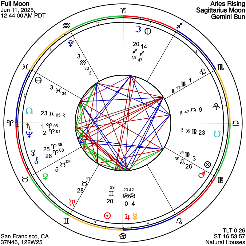 The Full Moon in Sagittarius of June 11th, 2025, at 12:44 AM Pacific Time, shines a bright spotlight on the greater meaning we can find and create in our lives and in the world. This Full Moon activates the inner philosopher and internal moral compass, asking not just where we’re going as individuals, but where we need to be going in our own lives and collectively. The Full Moon here encourages emotional honesty and invites big, beautiful questions – inquiries that open new pathways of awareness and help us step off the well-travelled road and into new open meadows of discovery.
