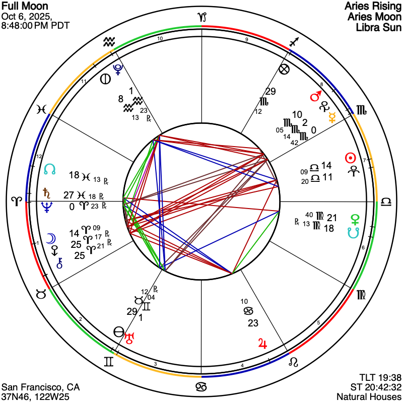 The Aries Full Moon of October 6th culminates at 14° 08’ of the sign, reaching exact at 8:48 PM PT, later evening and early morning next day for the east coast and Europe. This lunation also lands in the heart of this 2025 year that has been defined by seismic movement and metamorphosis, one that continues to reshape our collective landscape and also our personal sense of direction. The sign of Aries calls us back to the raw spark of selfhood, to the courage of being as true to ourselves as we can be, while beginning again. And this Full Moon does not arrive in isolation, as it reflects the larger tides of transformation underway as the outer planets step into new signs, opening portals into a new era of humanity.